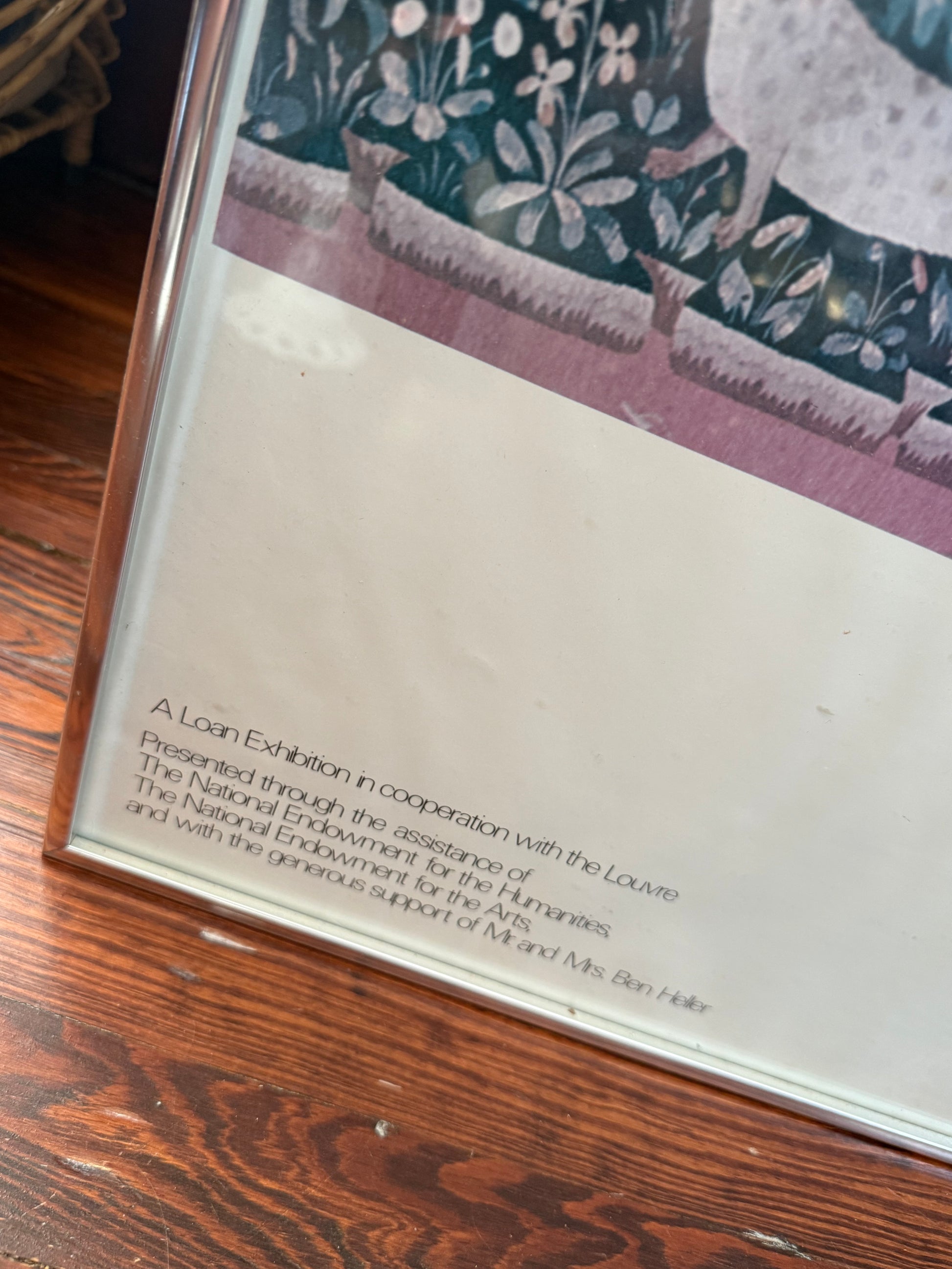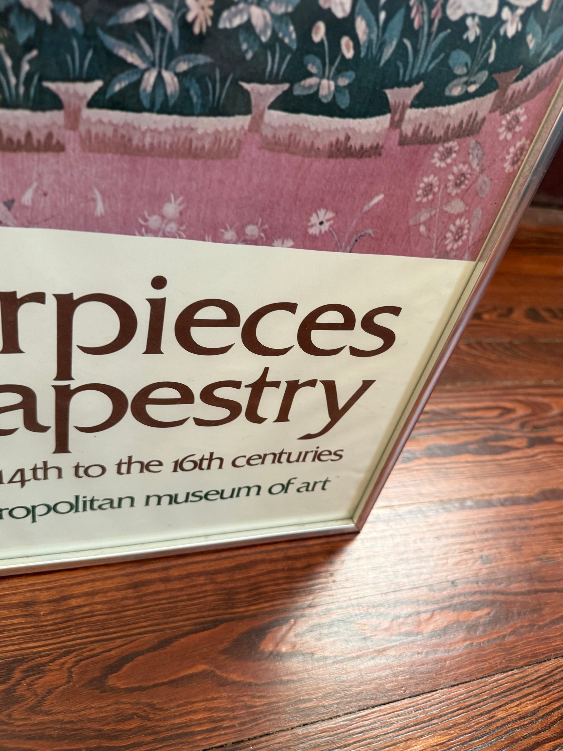 original 1974 poster of the unicorn tapestries from when they first came to the met! in a very high quality, solid frame. poster has some sun damage and fading as shown. this poster is hard to come by and a beautiful piece of history! measures by 38 inches by 24 inches