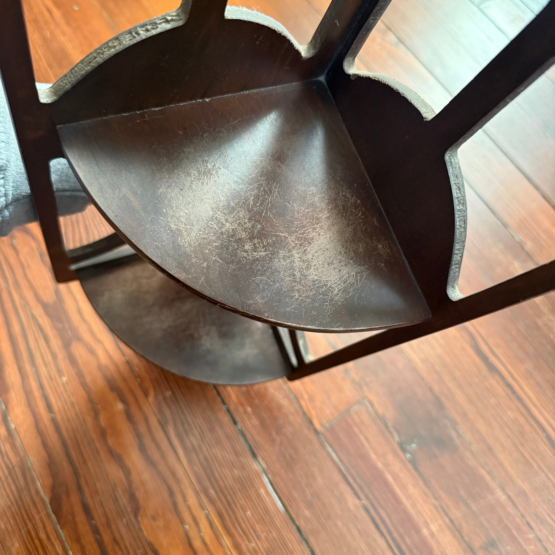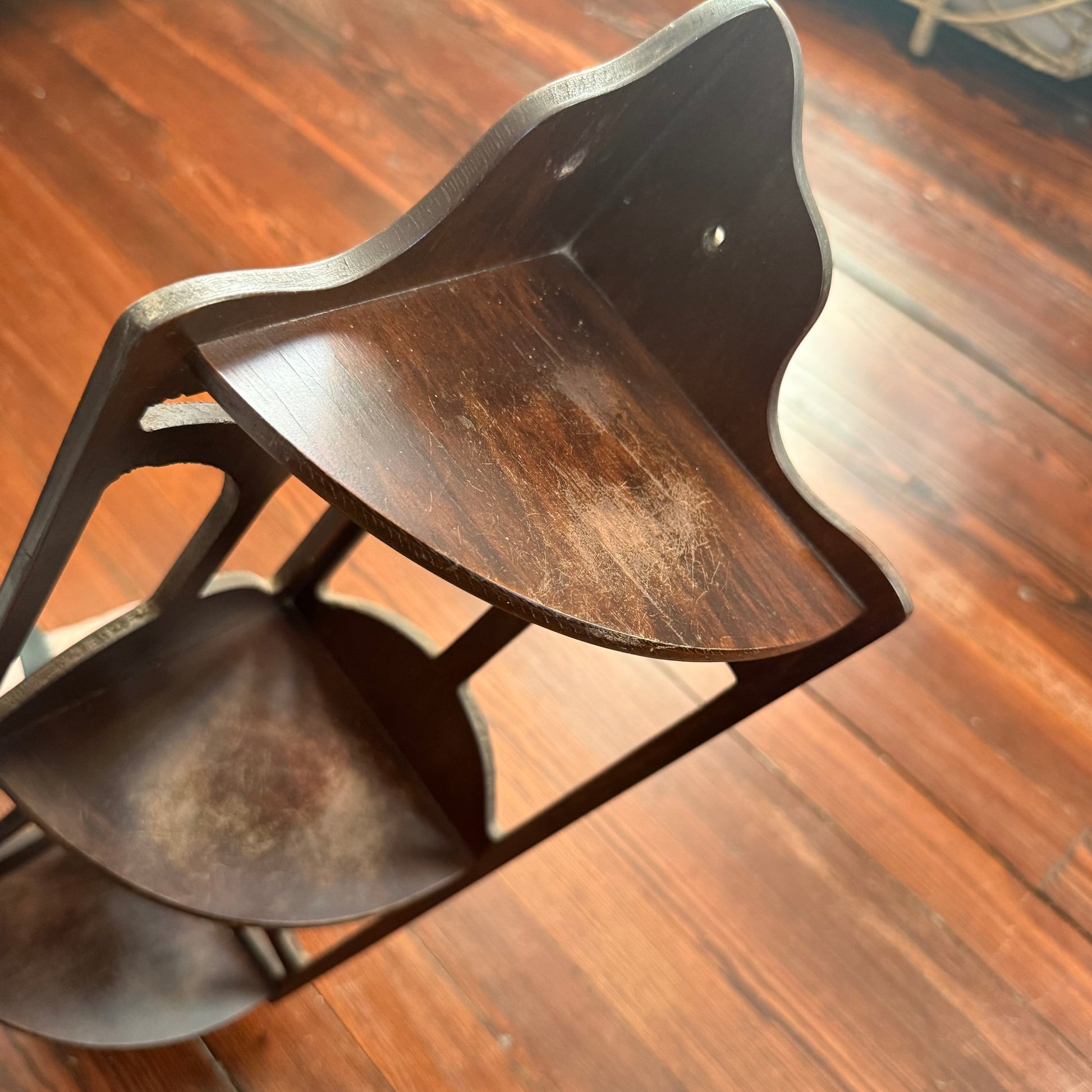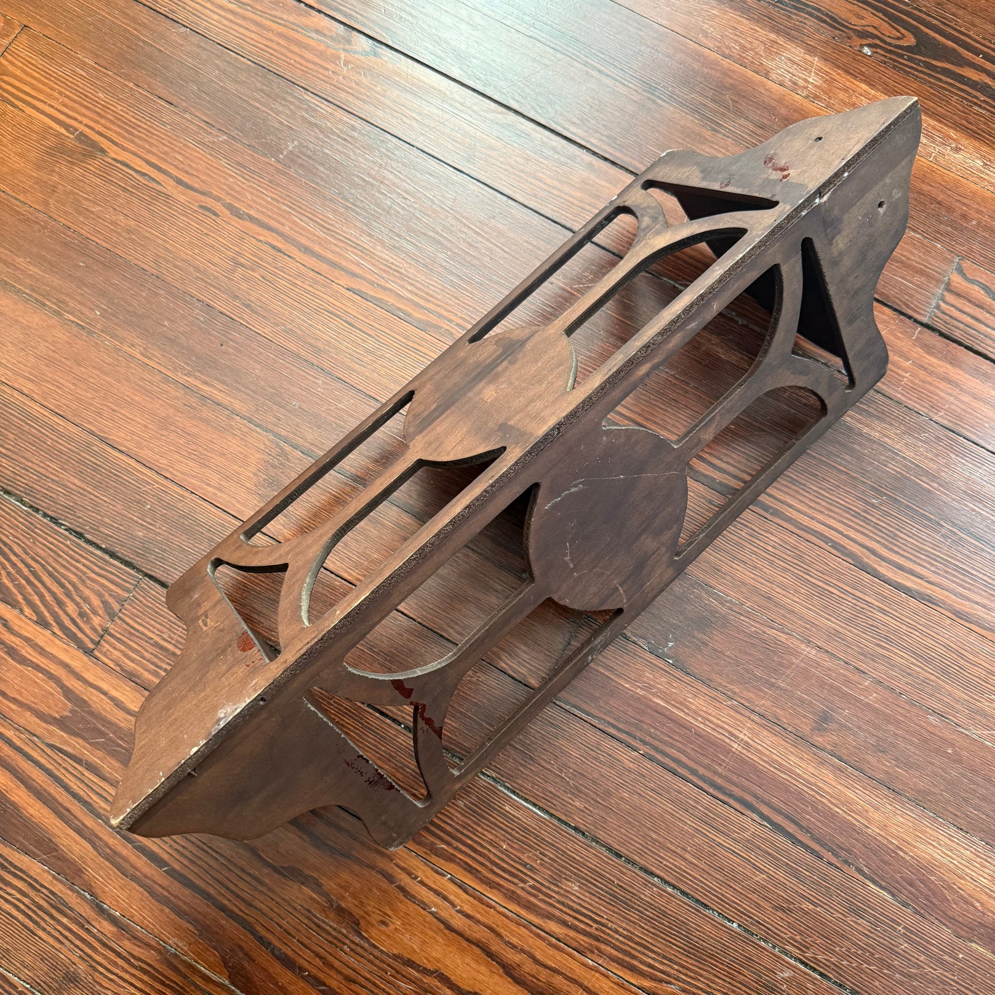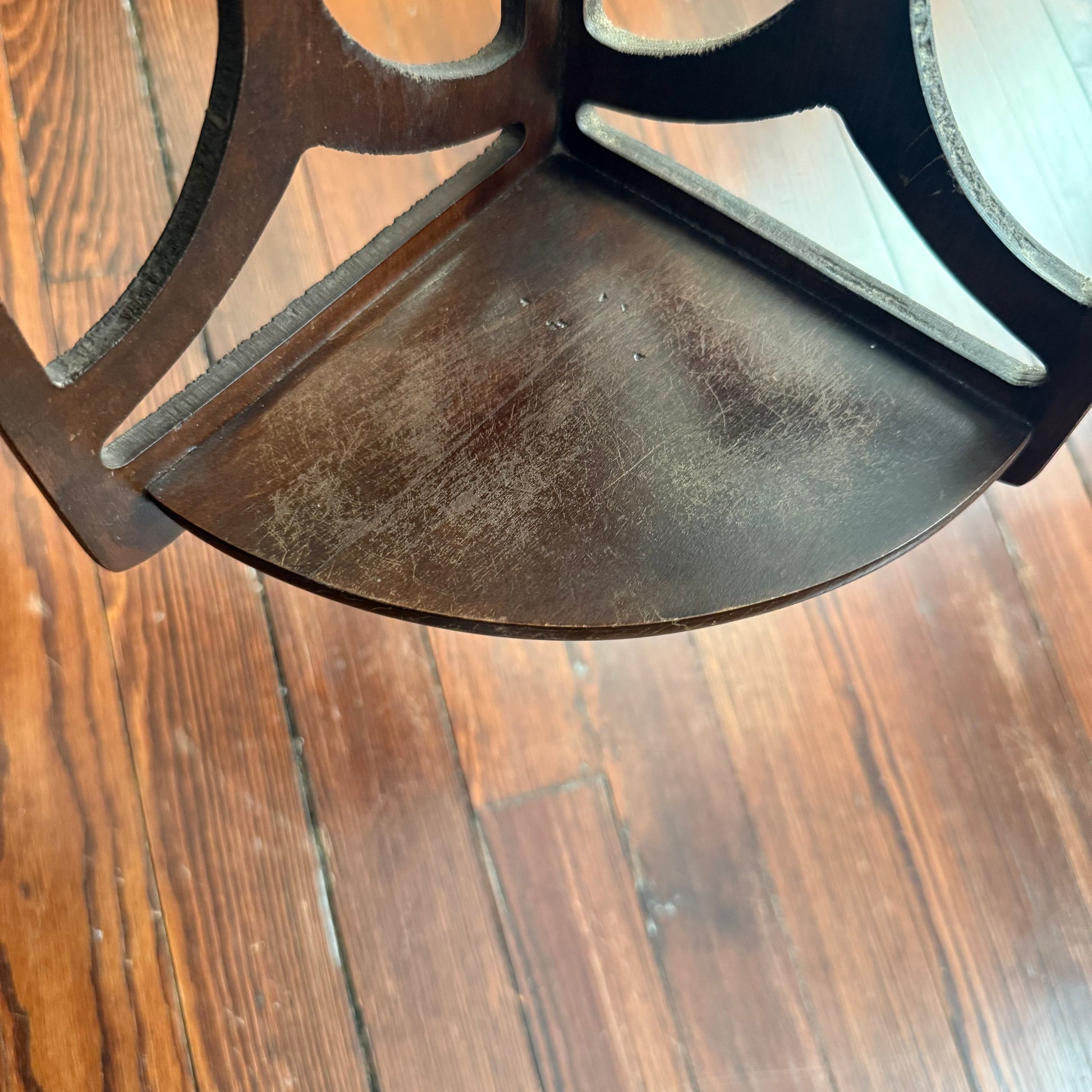 antique punch out wood 3 tier corner wall shelf. has some wear on the shelf surfaces as shown. ready to hand and display all of your trinkets! measures 23 inches tall