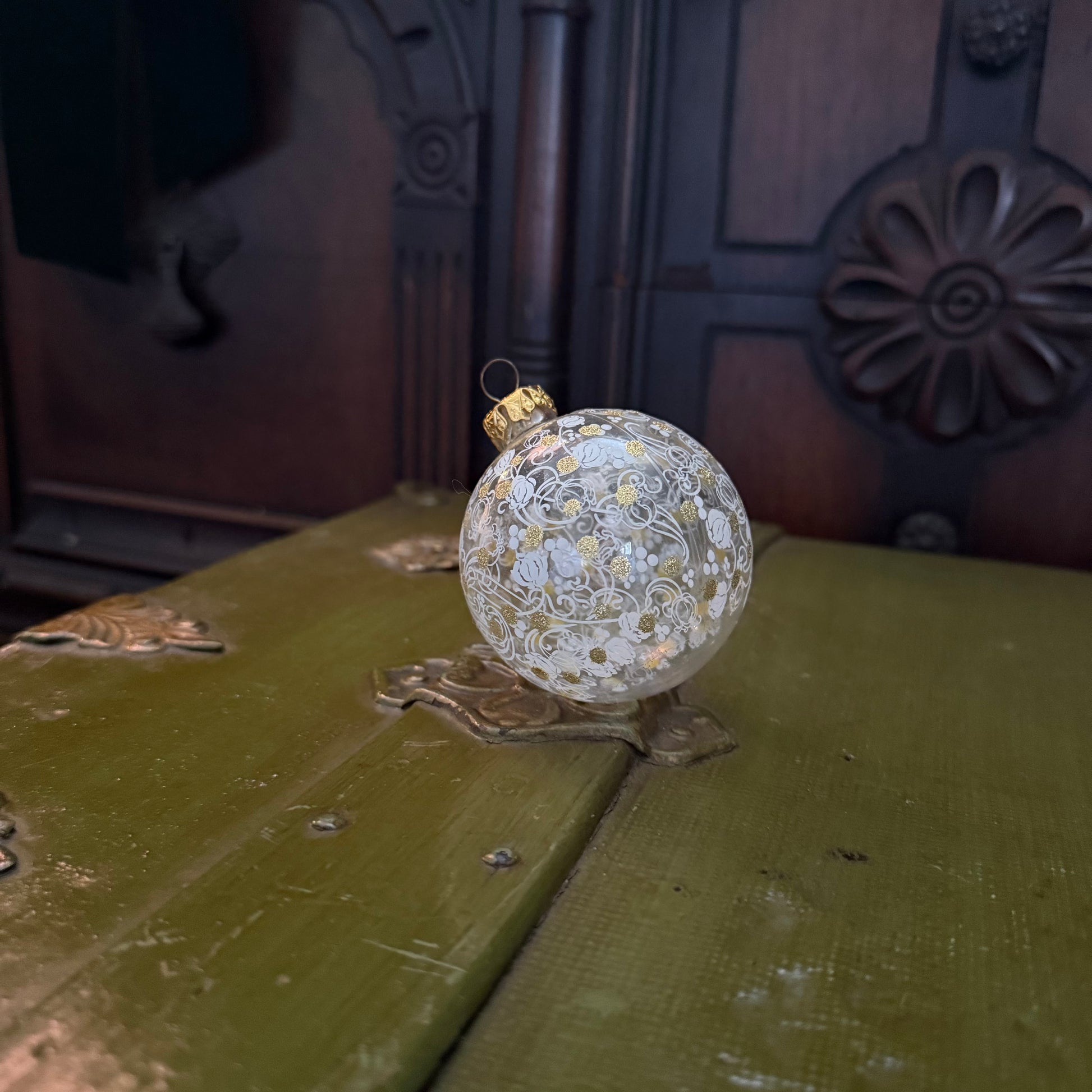 set of 3 vintage handmade glass ornaments. in good vintage shape with some minor discoloration, but no cracks or dents.