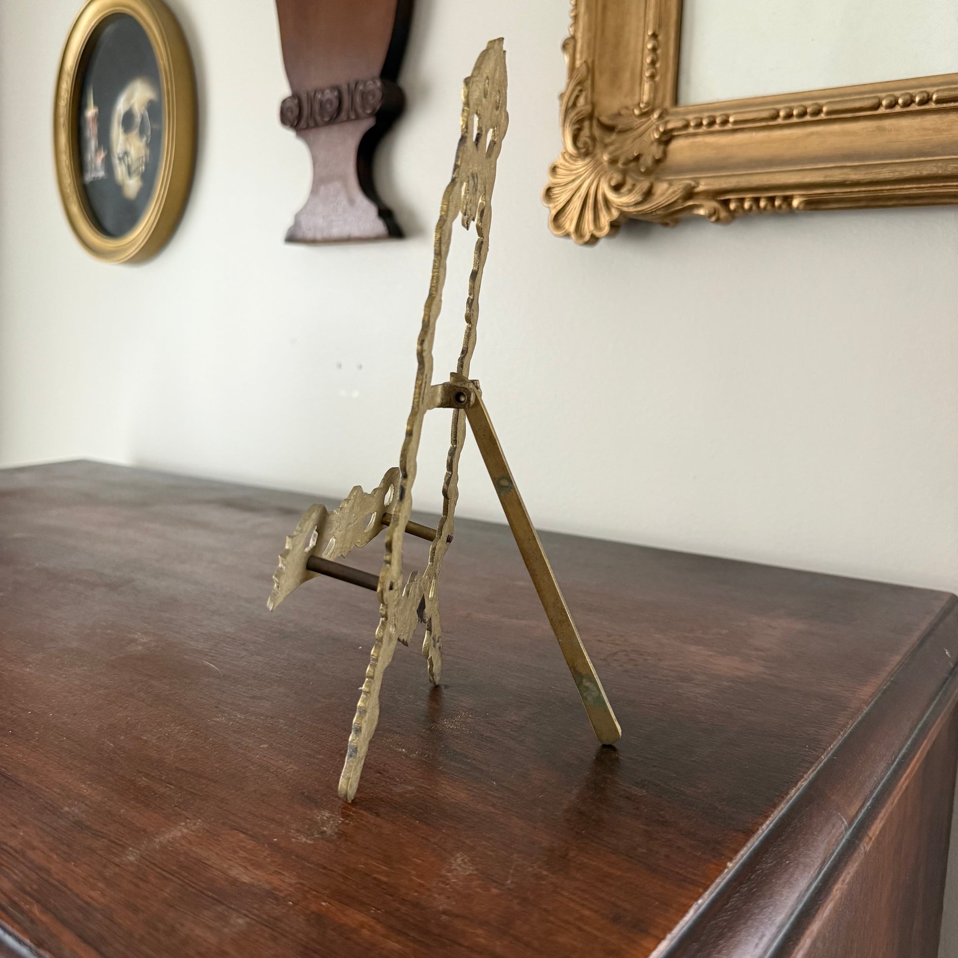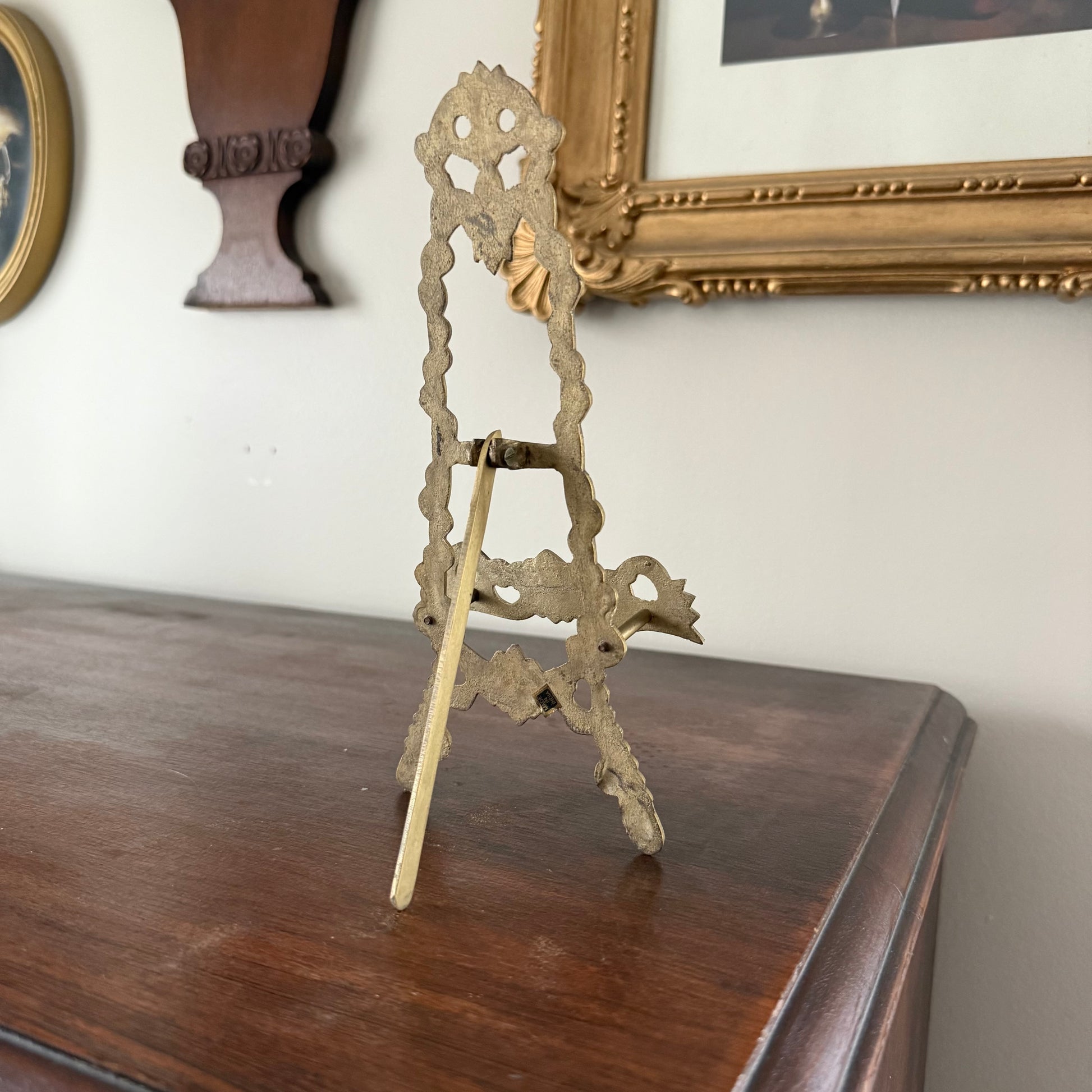 lovely little ornate brass easel perfect for housing your favorite trinket or work of art. some light tarnishing and signs of age, but overall great condition. measures 9 inches tall