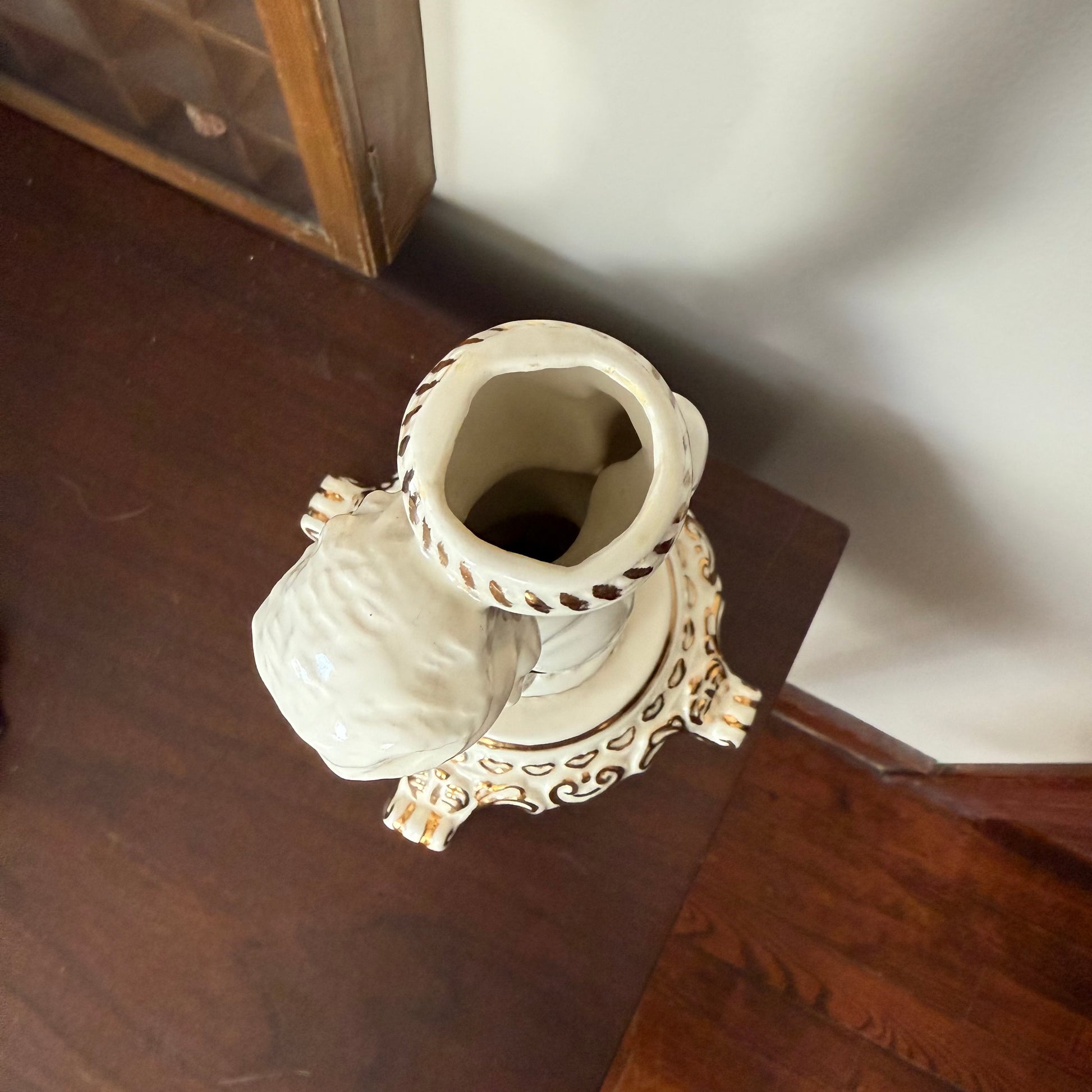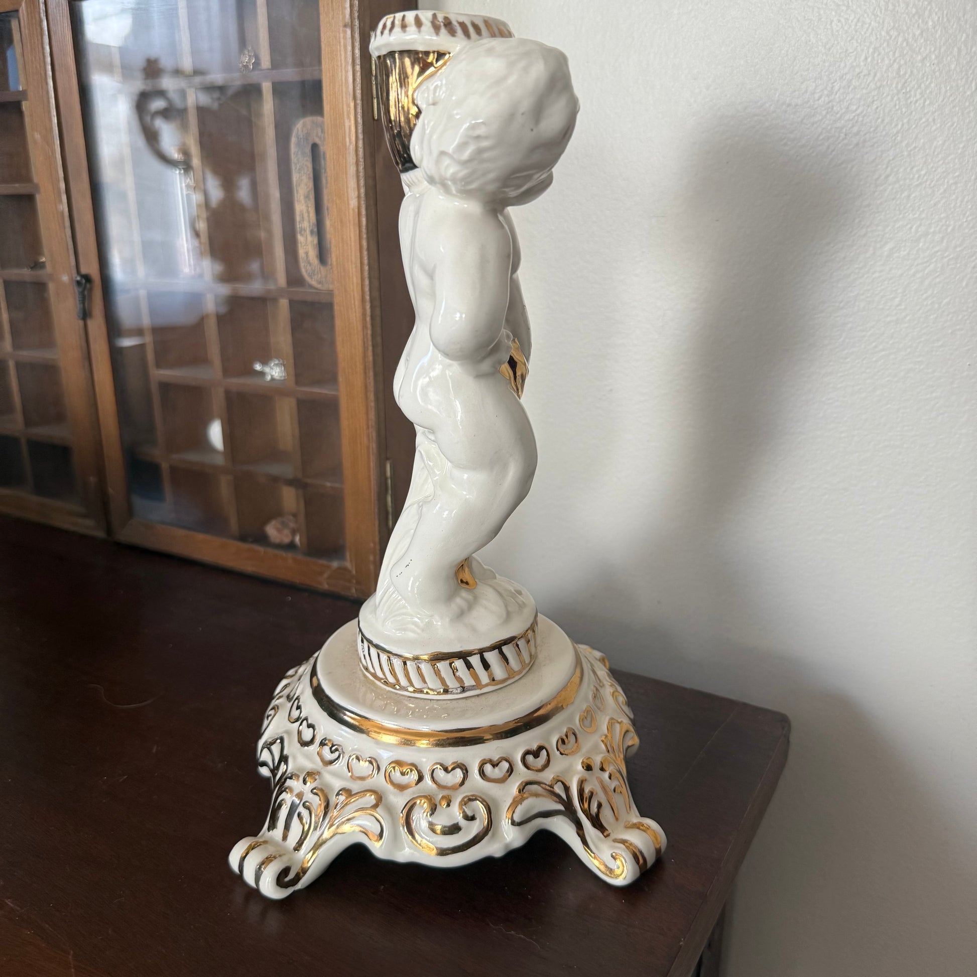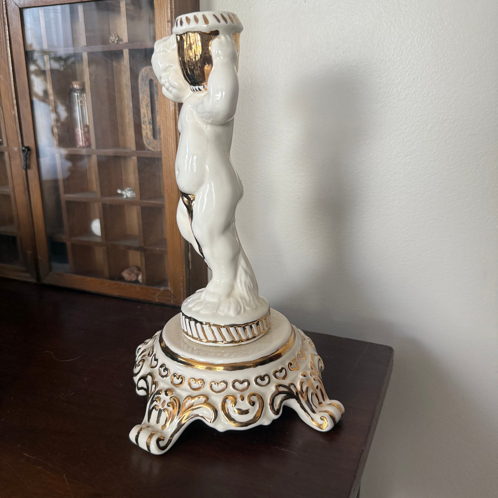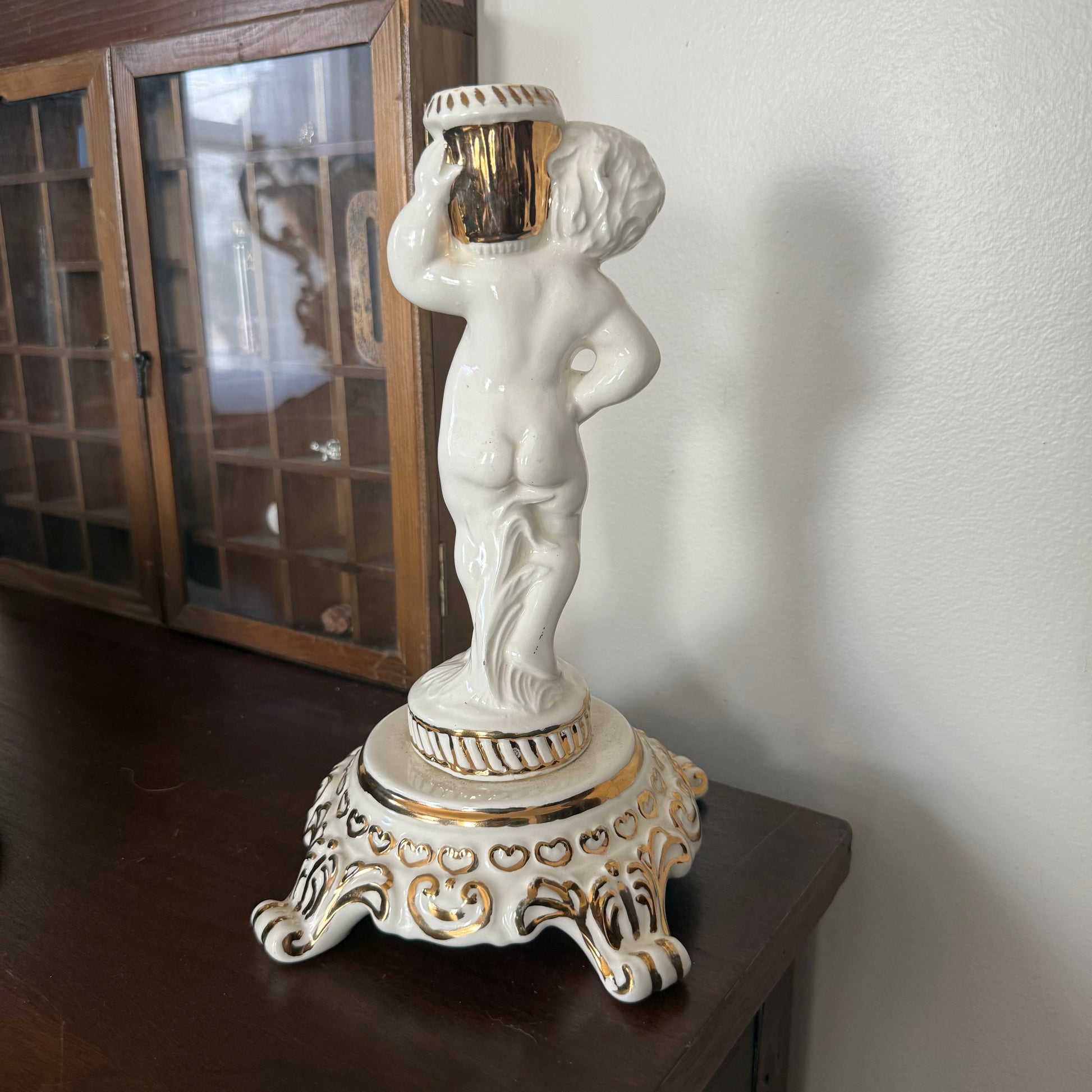 large gold and white ceramic cherub candle holder. could also be used to hold faux or dried flowers (the base does have an opening in it) has a few scuffs, but overall excellent shape! measures 11 inches tall