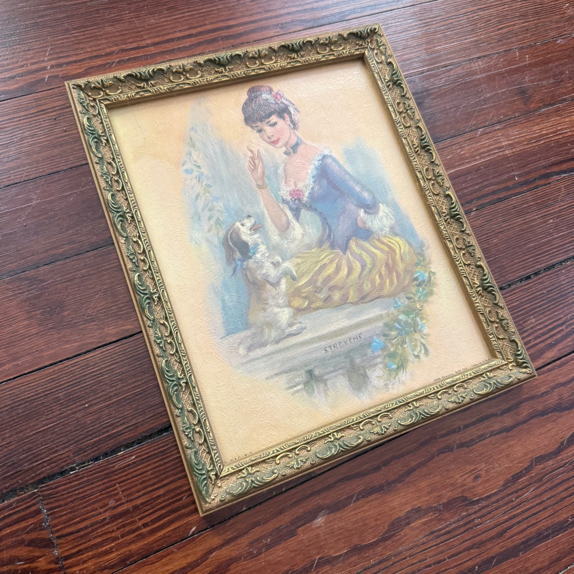 victorian style girl with dog print on board. in gorgeous gold frame! frame has some patina, but overall in solid shape. measures 9 inches x 11 inches