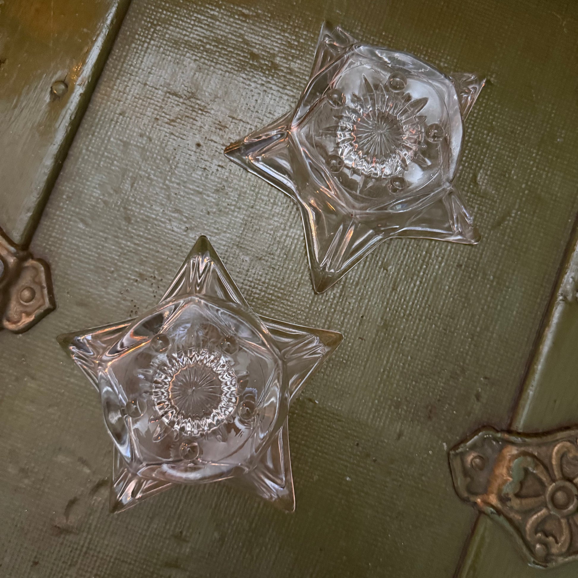 pair of vintage glass star shaped taper candle holders. no notable flaws. each measures 4.5 inches in diameter