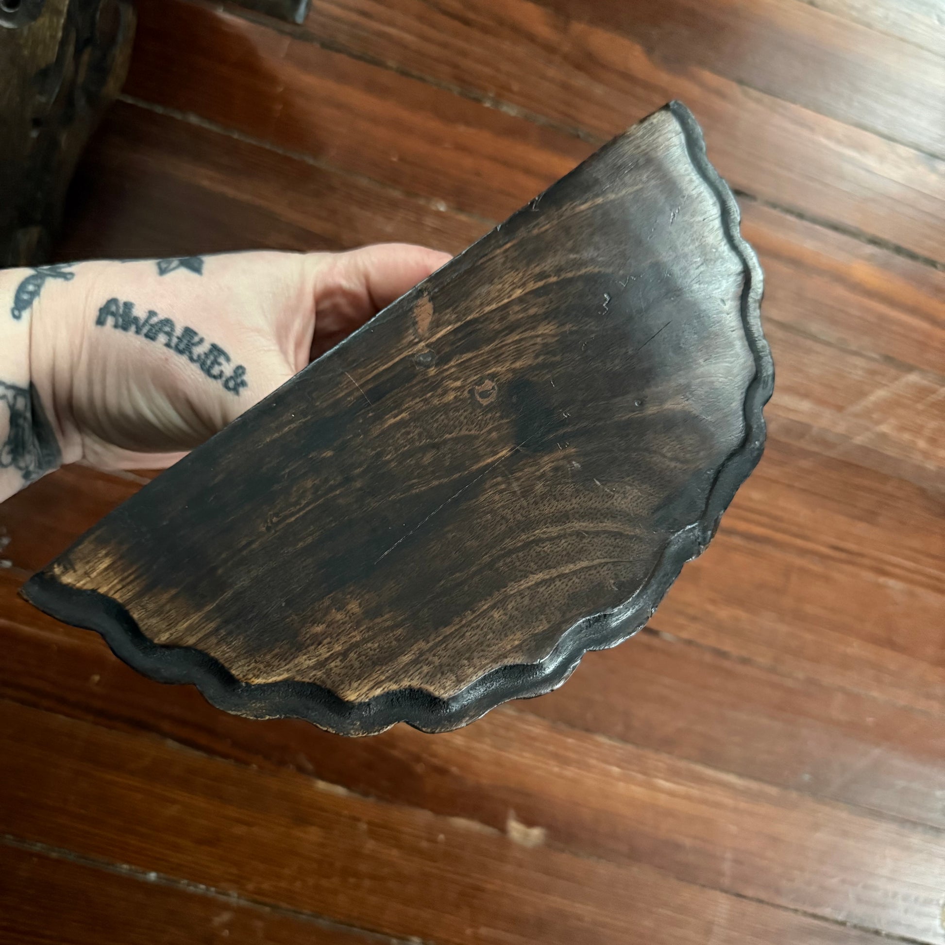 pair of 2 carved wooden wall shelves. have beautiful carved scroll details on the sides, and scalloped edged. each measures 9 inches tall and shelf surface is 9 inches wide x 4 inches deep at widest point