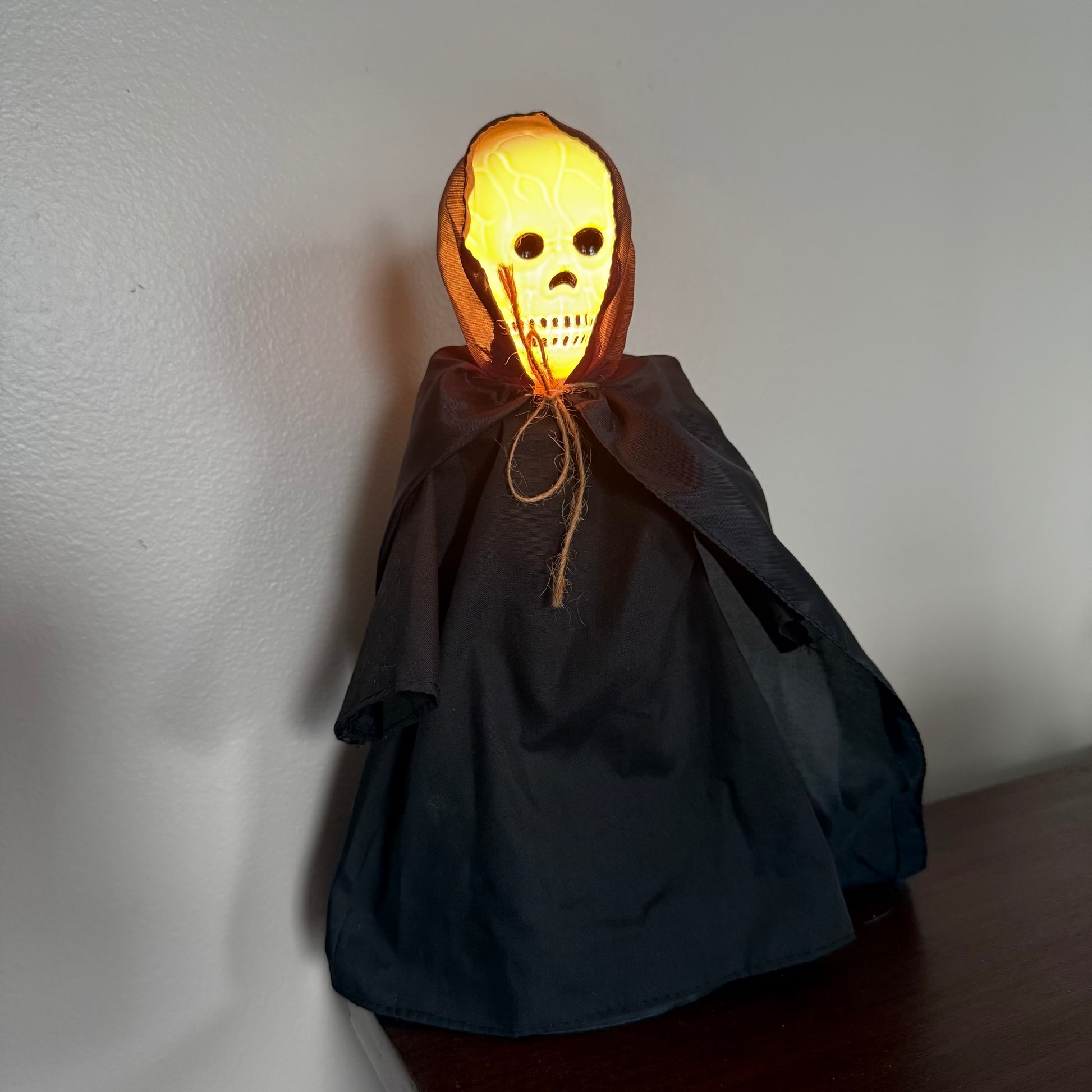 vintage blow mold skeleton reaper light. includes bulb and works! Has some minor signs of wear and includes the original box. measures 11 inches tall