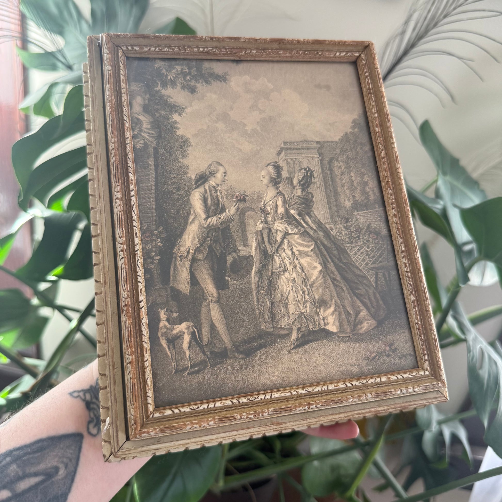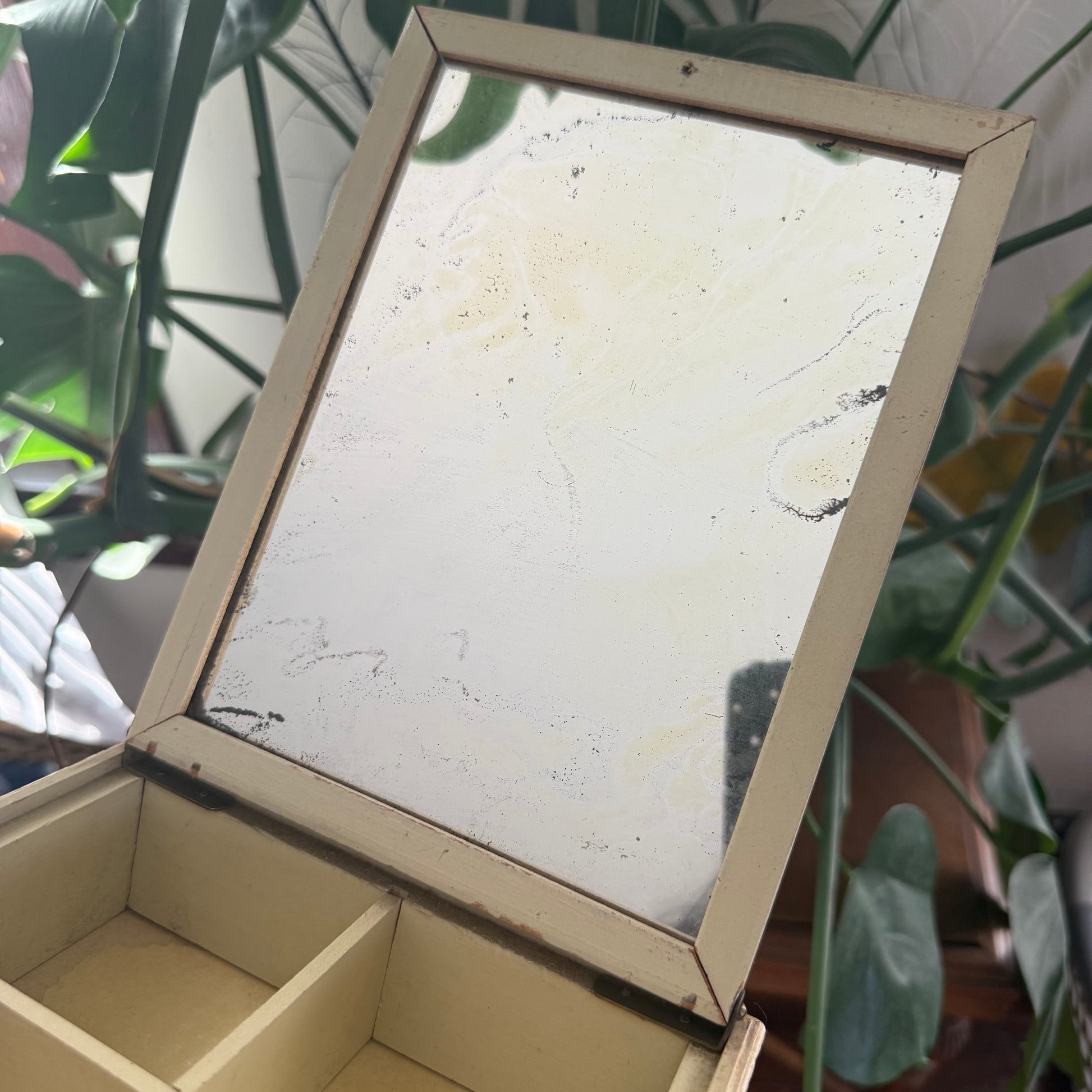 victorian revival dresser box featuring framed lithograph on the top, and mirror and compartments inside. some signs of age, but still a great piece! mirror has some flaws, and some light staining on the interior of the organizer as shown. measures 8 inches x 9.5 inches x 2.5 inches
